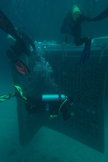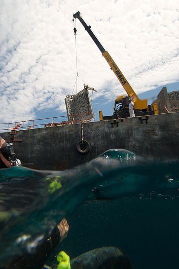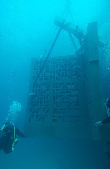 ![El proceso de instalación. Después de su hundimiento, los seis módulos de celosías fueron transladados por el equipo de buzos profesionales a su lugar definitivo, por medio de bolsas de aire.]()