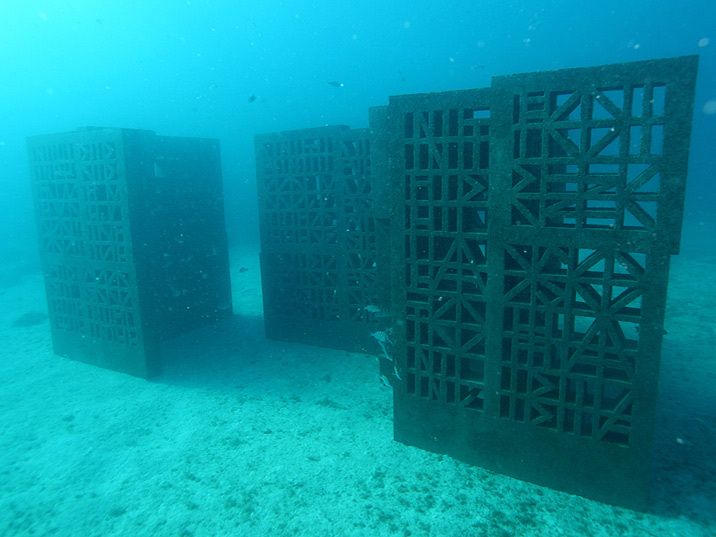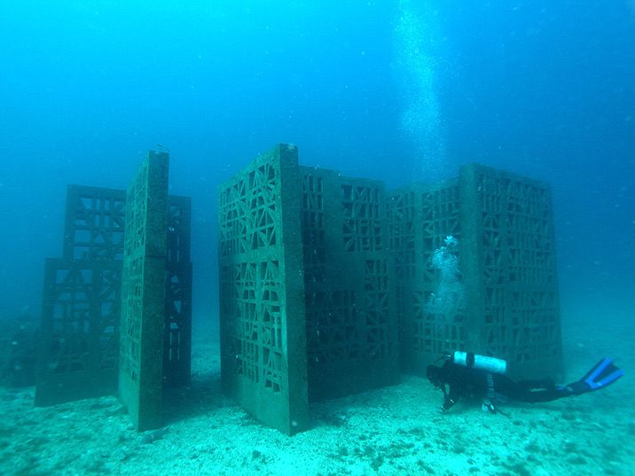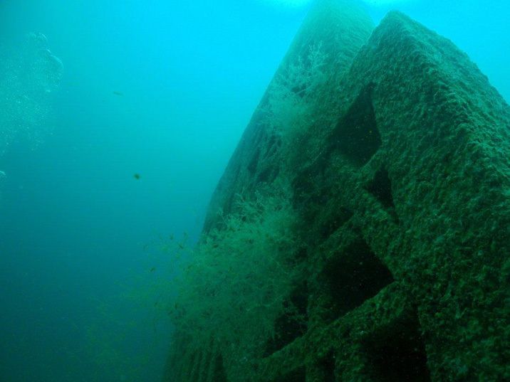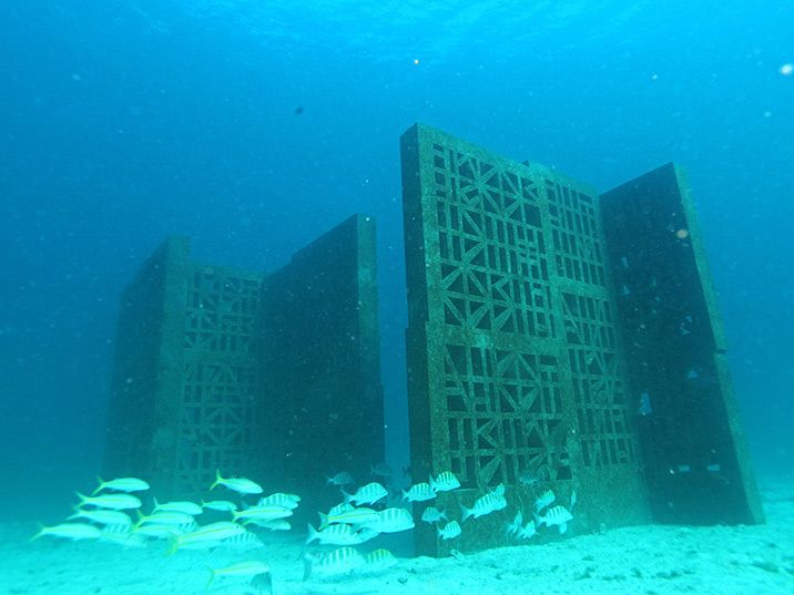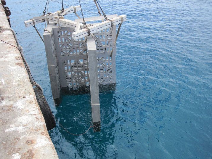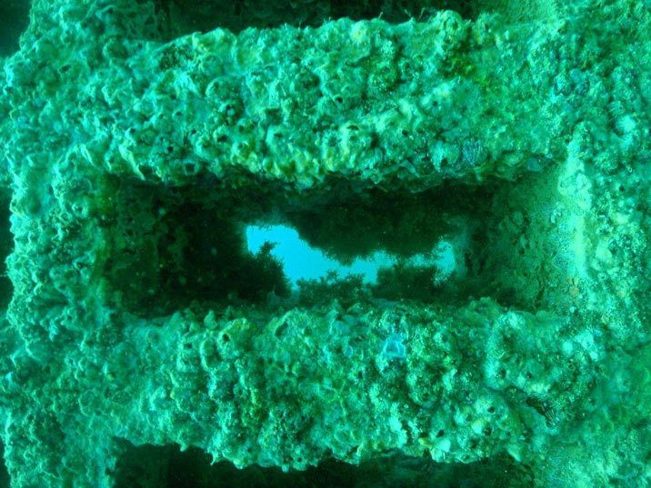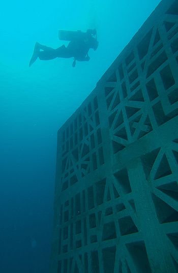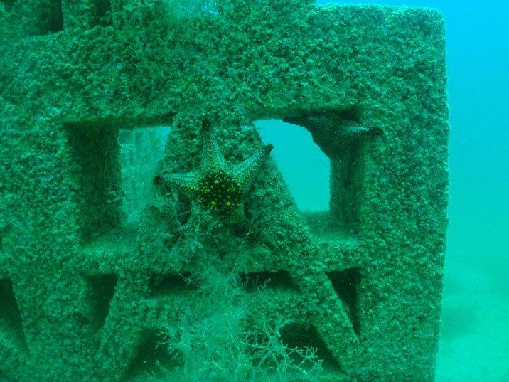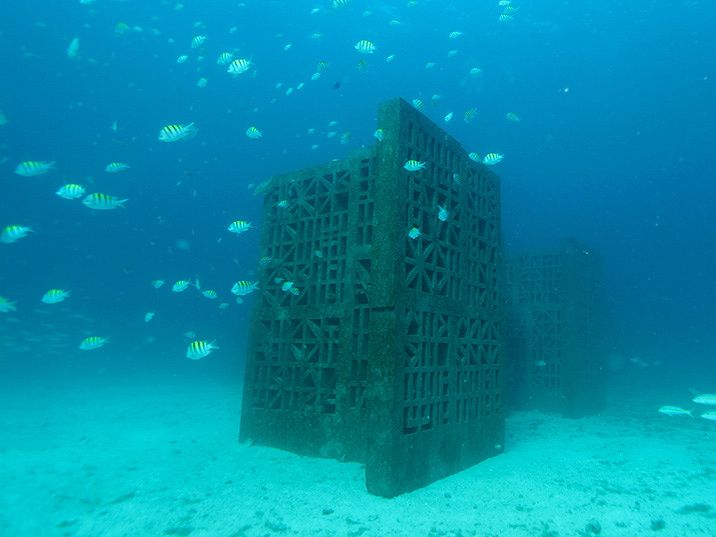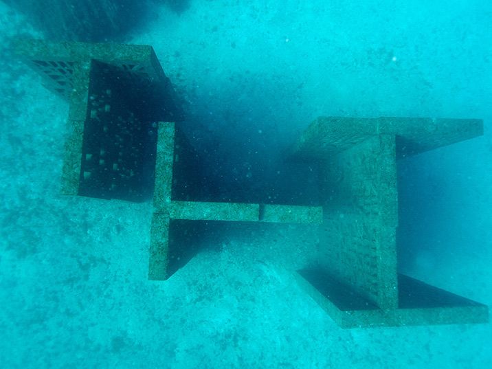 ![Vista a los 10 meses de su instalación. La obra fue creada para ayudar a generar vida animal y vegetal en el fondo del mar.]()