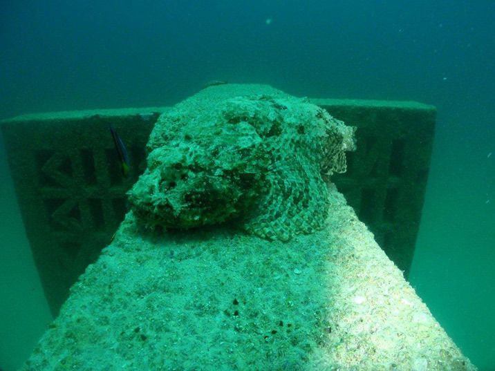 ![Un pez piedra o pez escorpión, conocido como el más venenoso del mundo, parece custodiar la obra.]()