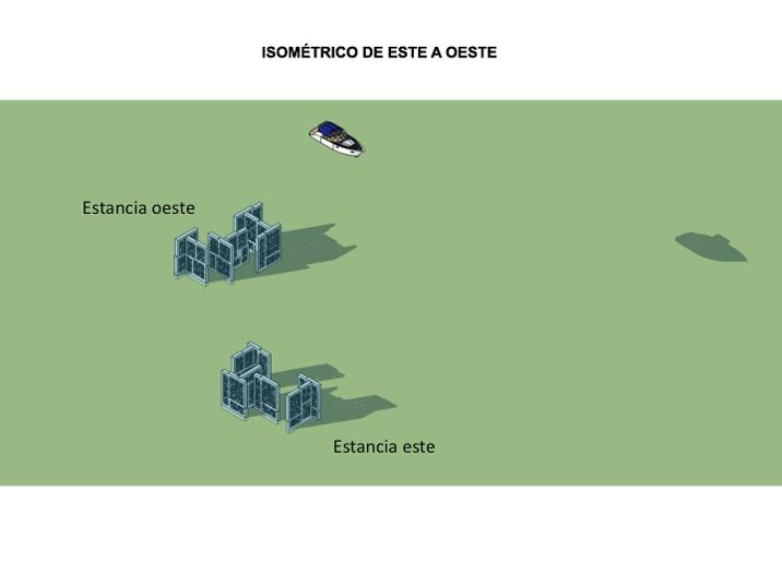 Isométrica de la colocación de las dos estancias. Isométrica donde se muestran los dos grupos de siete celosías cada uno, a la distancia que guardan entre sí.