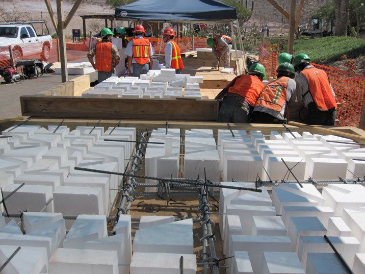 ![Vista de las celosías terminadas. Cada una de las 14 celosías fue vaciada en un molde de madera, con un concreto especial cuyo PH permite y ayuda a la colonización de diferentes especies en la pieza, al mismo tiempo que se comportara de la mejor manera posible en el ambiente submarino. Cada celosía pesa aproximadamente dos toneladas y mide 3.12 metros de alto, por 2.35 metros de ancho y 25 centímetros de espesor.]()