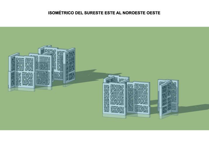 ![Isométrica de la colocación de las dos estancias. Isométrica donde se muestran los dos grupos de siete celosías cada uno, a la distancia que guardan entre sí.]()